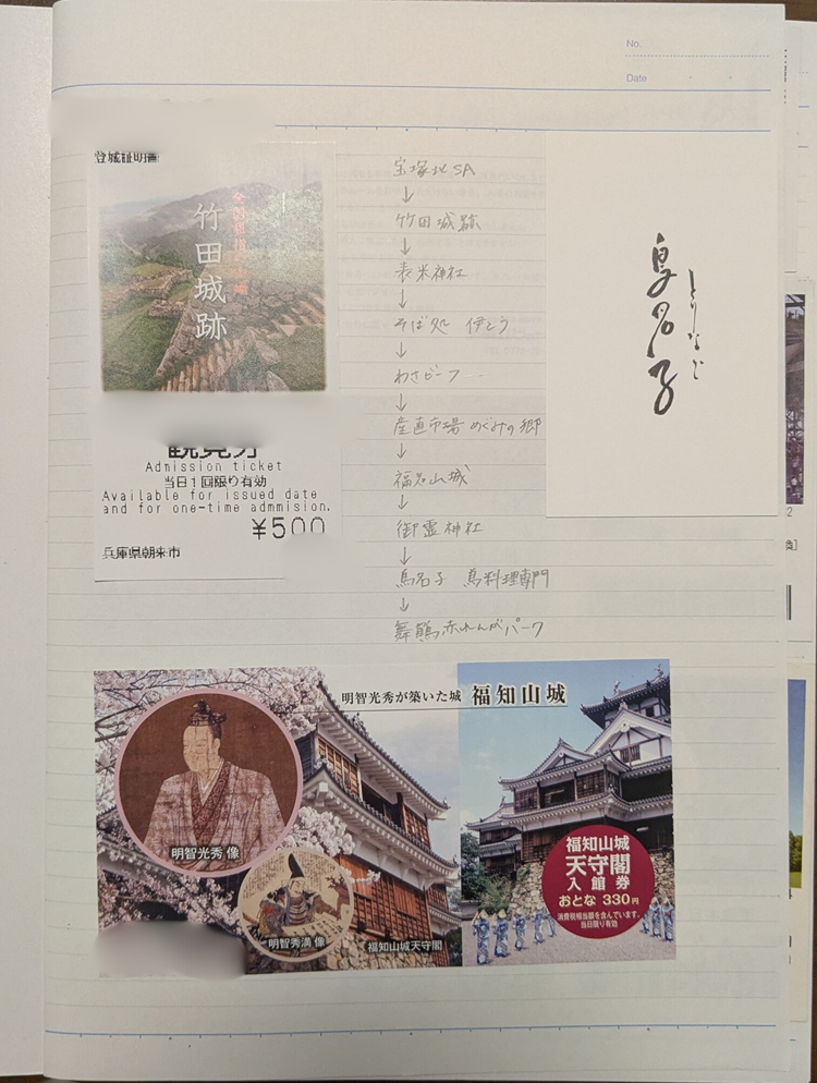 行った旅によって記載している内容は異なりますが、旅行のコースを記載したり、行ったスポットのチケットを貼ったり、観光地のスタンプを押したりして旅の記録を残しています(^^)/